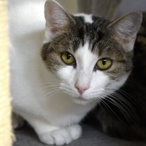 Lame fait partie des chats issus du retrait lié au syndrome de Diogène et de Noé. Malgré ce passé difficile, elle se distingue par un tempérament très gentil et curieux. Avec le temps, elle vient désormais plus facilement vers l’humain et montre un réel intérêt pour les interactions.